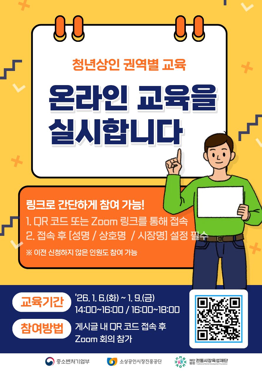 「전통시장 청년상인 온라인 공동판매전 운영 용역」 모집전통시장육성재단에서는 청년상인의 온라인 시장 진입 역량 강화 및 지속 가능한 유통 구조 기반을 마련하기위해다음과 같이 「전통시장 청년상인 온라인 공동판매전 운영 용역」을 공고하오니, 관심 있는 업체들의 많은 참여 부탁드립니다.■ 공고번호 : 제2025-007호■ 사 업 명 : 전통시장 청년상인 온라인 공동판매전 운영 용역 ■ 사업기간 : 계약체결일로부터 ~ '26. 2. 24.■ 주요과업 : 우수 청년상인 제품을 선정해 기획·배송·정산까지 통합 관리■ 추진일정 º 본 공고 : '25.11. 21(금) ~ '25. 12. 2(화) º 제안서 제출 : '25. 12. 1(월) 16:00까지 º 제안서 평가 : '25. 12. 2(화) 14:00부터 º 개찰 : '25. 12. 3(수) 10:00부터■ 나라장터 입찰공고 : 나라장터 국가종합전자조달 (g2b.go.kr)■ 문 의 처 : (재)전통시장육성재단 청년지원팀, 042-826-5934