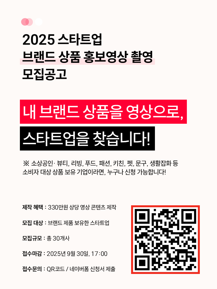 세부 지원내용 유튜브 콘텐츠 영상 1편 무료 제작(330만원 상당) / 제품 체험형 리뷰 및 대표자 스토리 기반 브랜드 콘텐츠, 제작된 영상은 브랜드 홍보, 마케팅 자료로 자유롭게 활용 가능